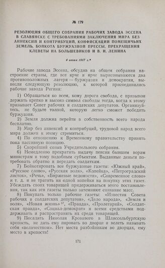Резолюция общего собрания рабочих завода Эссена в Славянске с требованиями заключения мира без аннексий и контрибуции, конфискации помещичьих земель, бойкота буржуазной прессы, прекращения клеветы на большевиков и В.И. Ленина. 4 июня 1917 г. // «Пролетарий», № 59, 4 июня 1917 г.