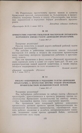 Письмо наборщиков в редакцию газеты «Донецкий пролетарий» с протестом против травли Временным правительством большевистской печати. 7 июня 19/7 г. // «Донецкий пролетарий» (Луганск), № 6, 7 июня 1917 г.