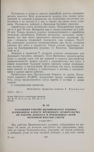 Резолюция рабочих Щербиновского рудника, осуждающая клевету Временного правительства на рабочих Донбасса и признающая своей верховной властью Советы. 14 июня 1917 г. // «Звезда», № 21, 20 июня 1917 г.