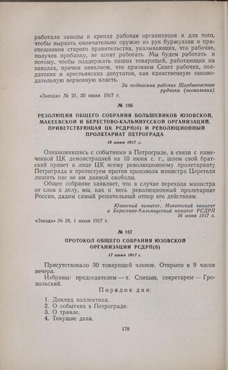 Резолюция общего собрания большевиков Юзовской, Макеевской и Берестово-Кальмиусской организаций, приветствующая ЦК РСДРП(б) и революционный пролетариат Петрограда. 16 июня 1917 г.