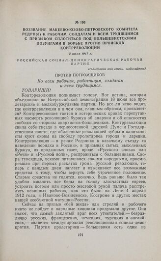 Воззвание Макеево-Юзово-Петровского комитета РСДРП(б) к рабочим, солдатам и всем трудящимся с призывом сплотиться под большевистскими лозунгами в борьбе против происков контрреволюции. 2 июля 1917 г.
