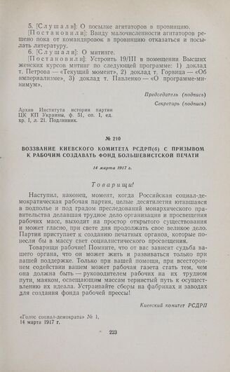 Воззвание Киевского комитета РСДРП(б) с призывом к рабочим создавать фонд большевистской печати. 14 марта 1917 г. // «Голос социал-демократа», № 1, 14 марта 1917 г.