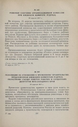 Решения собрания организационной комиссии при Киевском комитете РСДРП(б). 25 апреля 1917 г. // «Голос социал-демократа», № 18, 30 апреля 1917 г.