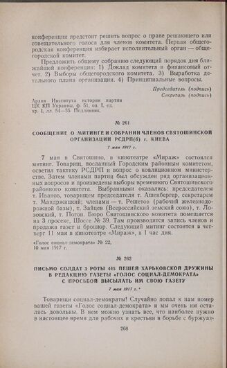 Сообщение о митинге и собрании членов Святошинской организации РСДРП(б) г. Киева. 7 мая 1917 г. // «Голос социал-демократа», № 22, 10 мая 1917 г.