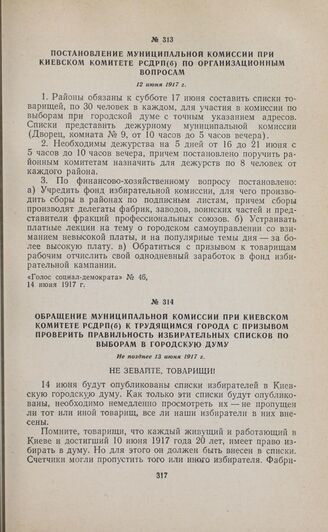 Обращение муниципальной комиссии при Киевском комитете РСДРП(б) к трудящимся города с призывом проверить правильность избирательных списков по выборам в городскую думу. Не позднее 13 июня 1917 г. // Госархив Киевской области, ф. 923, оп. 1, ед. хр. 5, л. 66. Копия.