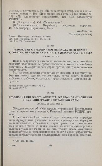 Резолюция с требованием перехода всей власти к Советам, принятая на митинге в детском саду г. Киева. 15 июня 1917 г. // «Голос социал-демократа», № 47, 15 июня 1917 г.