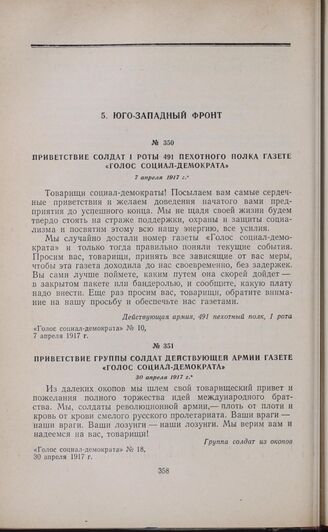 Приветствие группы солдат действующей армии газете «Голос социал-демократа». 30 апреля 1917 г. // «Голос социал-демократа», № 18, 30 апреля 1917 г.