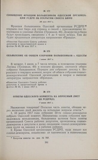 Ответы Одесского комитета на опросный лист ЦК РСДРП(б). 7 июня 1917...
