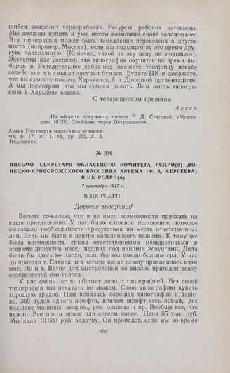 Письмо секретаря областного комитета РСДРП(б) Донецко-Криворожского бассейна Артема (Ф.А. Сергеева) в ЦК РСДРП(б). 7 сентября 1917 г. // Архив Института марксизма-ленинизма, ф. 17,, оп. 1, ед. хр. 275, л. 4. Подлинник.