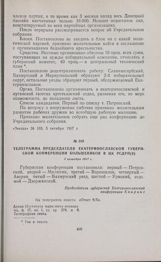 Телеграмма председателя Екатеринославской губернской конференции большевиков в ЦК РСДРП(б). 2 октября 1917 г.