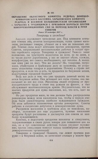 Обращение областного комитета РСДРП(б) Донецко- Криворожского бассейна, Харьковского комитета РСДРП(б) и военной большевистской организации г. Харькова к трудящимся с призывом бороться против контрреволюционных сил за переход власти в руки Советов. Ранее 26 октября 1917 г. // ЦГАОР УССР, инв. № 21.