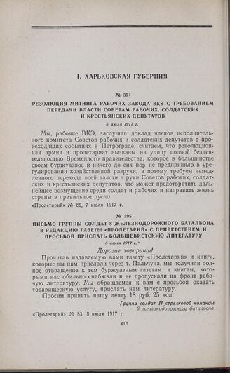 Письмо группы солдат 8 железнодорожного батальона в редакцию газеты «Пролетарий» с приветствием и просьбой прислать большевистскую литературу. б июля 1917 г. // «Пролетарий», № 83. 5 июля 1917 г.