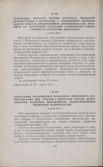 Резолюция протеста против расстрела июльской демонстрации в Петрограде с требованием передачи власти Советам, предложенная большевистской фракцией на экстренном заседании Харьковского Совета рабочих и солдатских депутатов. 6 июля 1917 г.