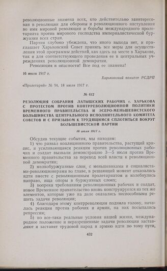 Резолюция собрания латышских рабочих г. Харькова с протестом против контрреволюционной политики Временного правительства и эсеро-меньшевистского большинства Центрального Исполнительного Комитета Советов и с призывом к трудящимся сплотиться вокруг ...