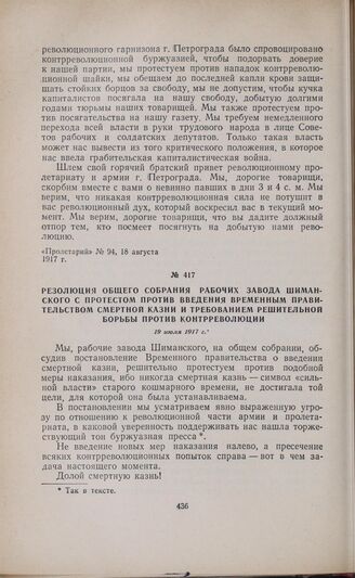 Резолюция общего собрания рабочих завода Шиманского с протестом против введения Временным правительством смертной казни и требованием решительной борьбы против контрреволюции. 19 июля 1917 г. // «Пролетарий», № 95, 19 июля 1917 г.