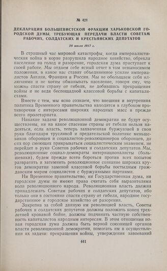 Декларация большевистской фракции Харьковской городской думы, требующая передачи власти Советам рабочих, солдатских и крестьянских депутатов. 26 июля 1917 г.