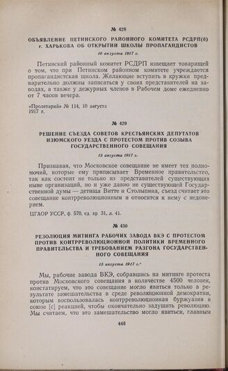 Резолюция митинга рабочих завода ВКЭ с протестом против контрреволюционной политики Временного правительства и требованием разгона Государственного совещания. 15 августа 1917 г. // «Пролетарий», № 118, 15 августа 1917 г.