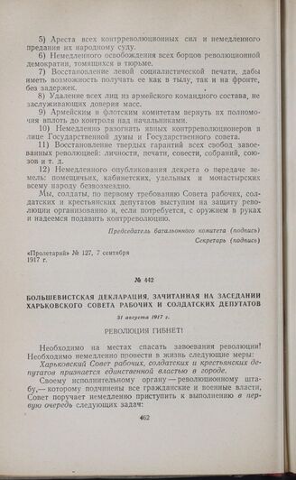 Большевистская декларация, зачитанная на заседании Харьковского Совета рабочих и солдатских депутатов. 31 августа 1917 г. // «Пролетарий», № 125, 3 сентября 1917 г.