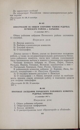 Информация об общем собрании членов РСДРП(б) Петинского района г. Харькова. 11 сентября 1917 г. // «Пролетарий», № 133, 19 сентября 1917 г.