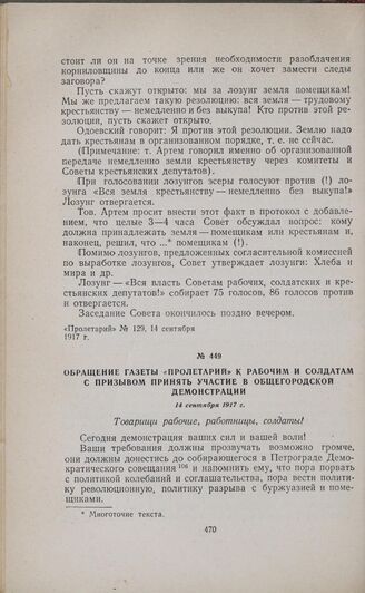Обращение газеты «Пролетарий» к рабочим и солдатам с призывом принять участие в общегородской демонстрации. 14 сентября 1917 г.