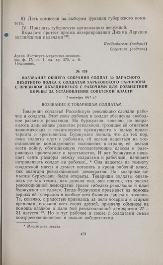Воззвание общего собрания солдат 30 запасного пехотного полка к солдатам Харьковского гарнизона с призывом объединиться с рабочими для совместной борьбы за установление советской власти. 7 октября 1917 г.