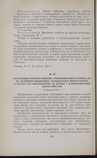 Резолюция митинга рабочих трубопрокатного завода «Б» об активной поддержке харьковского пролетариата в случае его выступления на борьбу с капиталистами-локаутчиками. 19 августа 1917 г.
