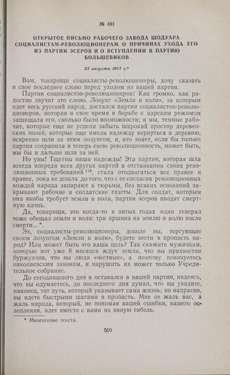 Открытое письмо рабочего завода Шодуара социалистам-революционерам о причинах ухода его из партии эсеров и о вступлении в партию большевиков. 25 августа 1917 г.