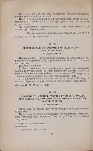 Сообщение о митинге рабочих Брянского завода, признавшем необходимость перехода всей власти в руки Советов. 30 августа 1917 г. // «Звезда», № 79, 1 сентября 1917 г.