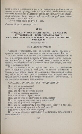 Передовая статья газеты «Звезда» с призывом к трудящимся г. Екатеринослава выйти на демонстрацию в день открытия Демократического совещания. 12 сентября 1917 г. // «Звезда», № 87, 12 сентября 1917 г.