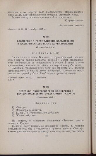 Протокол общегородской конференции Екатеринославской организации РСДРП(б). 22 сентября 1917 г. // «Звезда», № 95, 24 сентября 1917 г.