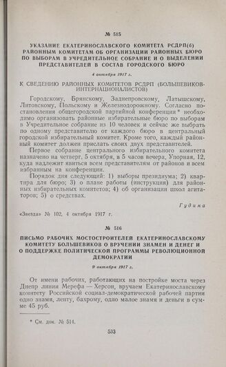Указание Екатеринославского комитета РСДРП(б) районным комитетам об организации районных бюро по выборам в Учредительное собрание и о выделении представителей в состав городского бюро. 4 октября 1917 г. // «Звезда», № 102, 4 октября 1917 г.