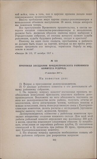 Протокол заседания Приднепровского районного комитета РСДРП(б). 17 октября 1917 г. // «Звезда», № 121, 26 октября 1917 г.