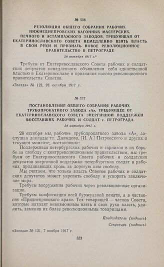Постановление общего собрания рабочих трубопрокатного завода «А», требующее от Екатеринославского Совета энергичной поддержки восставших рабочих и солдат г. Петрограда. 28 октября 1917 г.