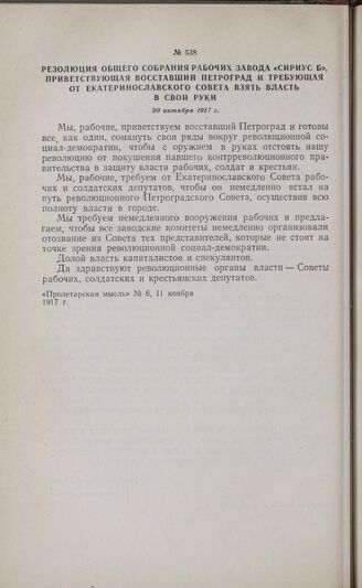 Резолюция общего собрания рабочих завода «Сириус Б», приветствующая восставший Петроград и требующая от Екатеринославского Совета взять власть в свои руки. 30 октября 1917 г.