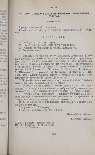 Протокол общего собрания Юзовской организации РСДРП(б). 29 июля 1917 г.