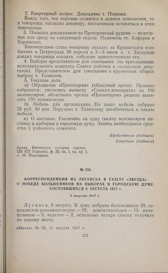 Корреспонденция из Луганска в газету «Звезда» о победе большевиков на выборах в городскую думу, состоявшихся 6 августа 1917 г. 8 августа 1917 г.