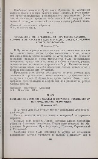 Сообщение об организации профессиональных союзов в Луганске и уезде и о подготовке к созданию совета профсоюзов. 25 августа 1917 г. // «Донецкий пролетарий» (Луганск), № 61, 25 августа 1917 г.