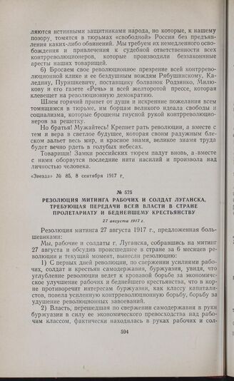 Резолюция митинга рабочих и солдат Луганска, требующая передачи всей власти в стране пролетариату и беднейшему крестьянству. 27 августа 1917 г.