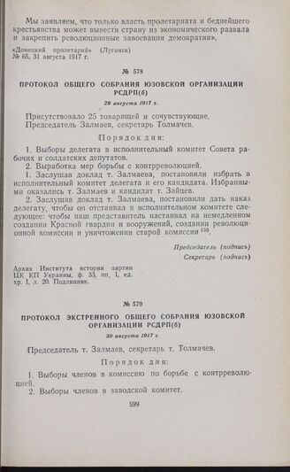 Протокол общего собрания Юзовской организации РСДРП(б). 29 августа 1917 г.