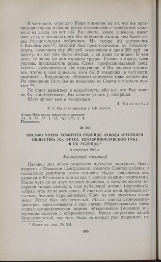 Письмо члена комитета РСДРП(б) завода «Русского Общества» (Ст. Ветка, Екатеринославской губ.). в ЦК РСДРП(б). 6 сентября 1917 г. // Архив Института марксизма-ленинизма, ф. 17, оп. 1, ед. хр. 279, лл. 9-10. Подлинник.