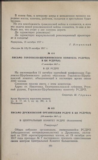 Письмо Горловско-Щербиновского комитета РСДРП(б) в ЦК РСДРП(б). 17 октября 1917 г.