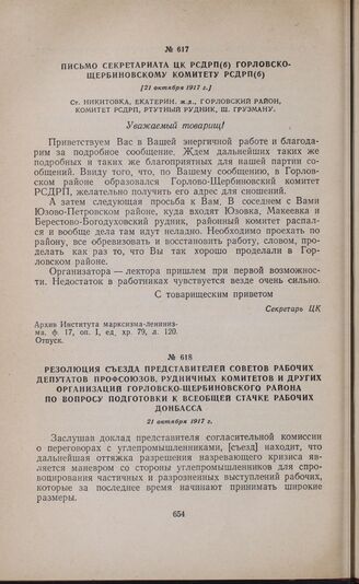 Письмо Секретариата ЦК РСДРП(б) Горловско-Щербиновскому комитету РСДРП(б). [21 октября 1917 г.] // Архив Института марксизма-ленинизма, ф. 17, оп. 1, ед. хр. 79, л. 120. Отпуск.