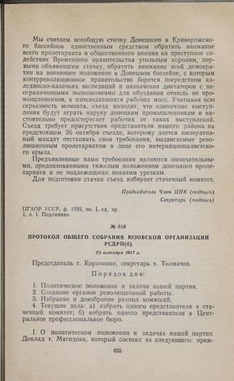 Протокол общего собрания Юзовской организации РСДРП(б). 23 октября ...