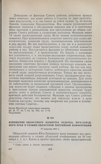 Извещение областного комитета РСДРП(б) Юго-Западного края о созыве областной партийной конференции. 27 августа 1917 г.