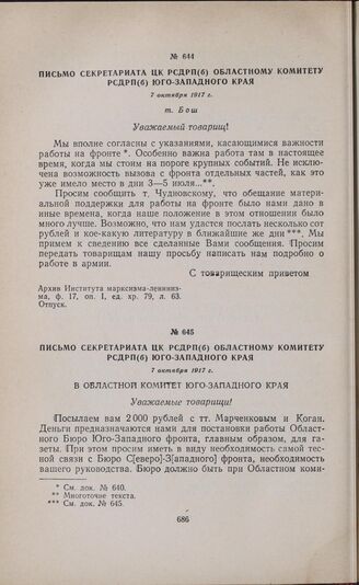 Письмо Секретариата ЦК РСДРП(б) областному комитету РСДРП(б) Юго-Западного края. 7 октября 1917 г. [1] // Архив Института марксизма-ленинизма, ф. 17, оп. 1, ед. хр. 79, л. 63. Отпуск.