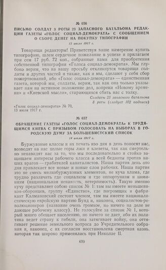 Письмо солдат 3 роты 23 запасного батальона редакции газеты «Голос социал-демократа» с сообщением о сборе денег на покупку типографии. 13 июля 1917 г.