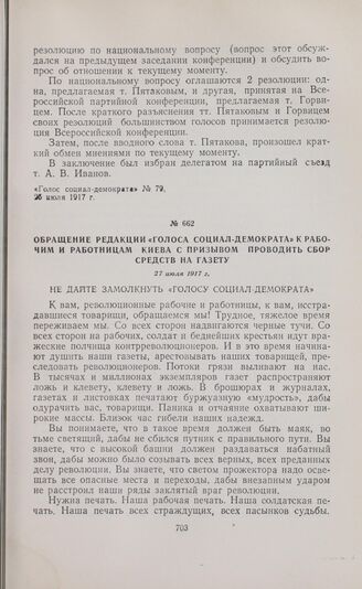 Обращение редакции «Голоса социал-демократа» к рабочим и работницам Киева с призывом проводить сбор средств на газету. 27 июля 1917 г.