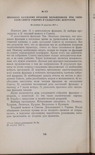 Протокол заседания фракции большевиков при Киевском Совете рабочих и солдатских депутатов. Не позднее 18 августа 1917 г. // «Голос социал-демократа», № 90, 20 августа 1917 г.