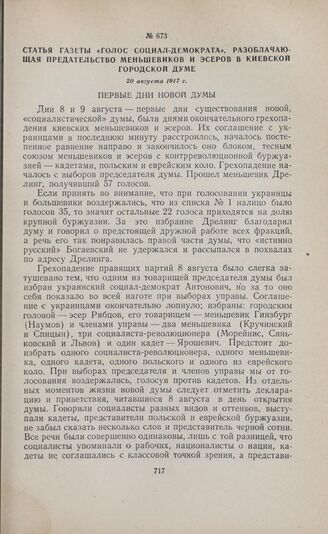 Статья газеты «Голос социал-демократа», разоблачающая предательство меньшевиков и эсеров в Киевской городской думе. 20 августа 1917 г.
