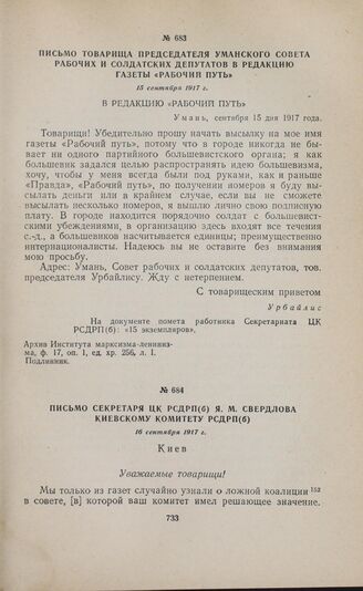 Письмо секретаря ЦК РСДРП(б) Я.М. Свердлова Киевскому комитету РСДРП(б). 16 сентября 1917 г. // Архив Института марксизма-ленинизма, ф. 17, оп. 1, ед. хр. 79, л. 6. Отпуск.